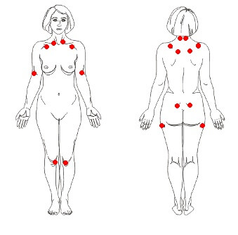 - Es fa la palpació dels 18 punts clau de dolor. La pacient ha de sentir dolor mínim en 11 punts.